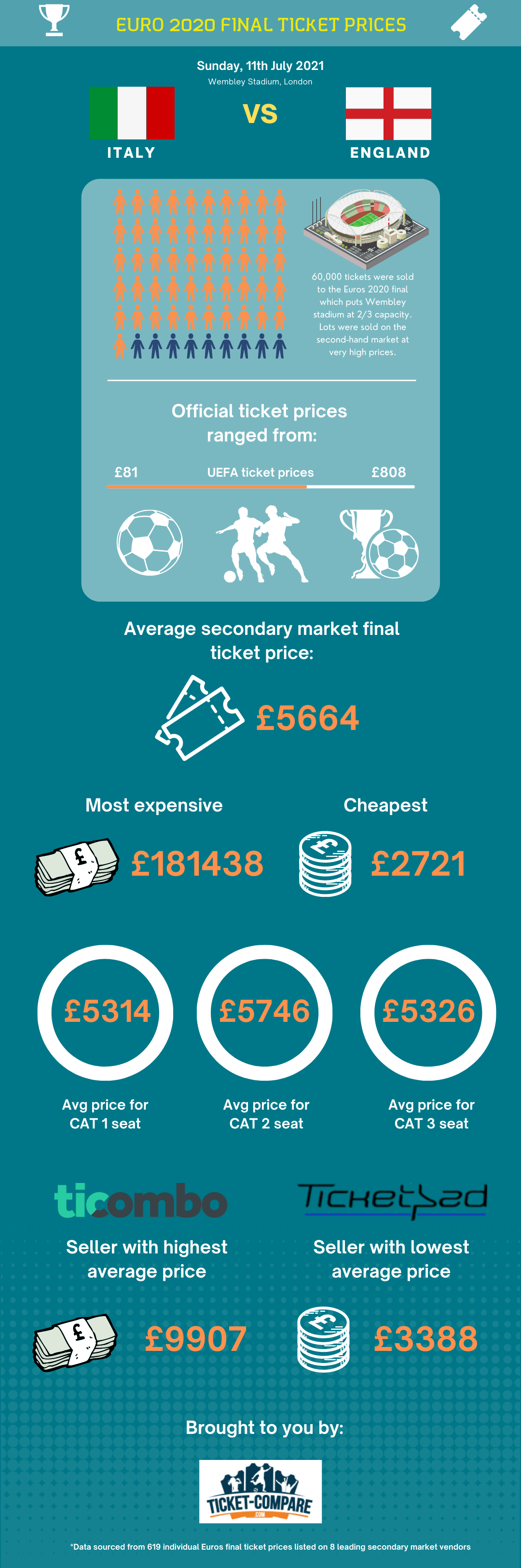 Officiella biljetter till EM 2020-finalen där Italien möter England på Wembley Stadium kostade från bara $108 och upp till $1,073 för de dyraste platserna. Även de högsta officiella priserna är dock små jämfört med de hisnande summor som biljetterna säljs för på andrahandsmarknaden. Vi har analyserat över 600 biljettpriser från 7 auktionssajter – här ser du det genomsnittliga teoretiska priset för en biljett till finalen.