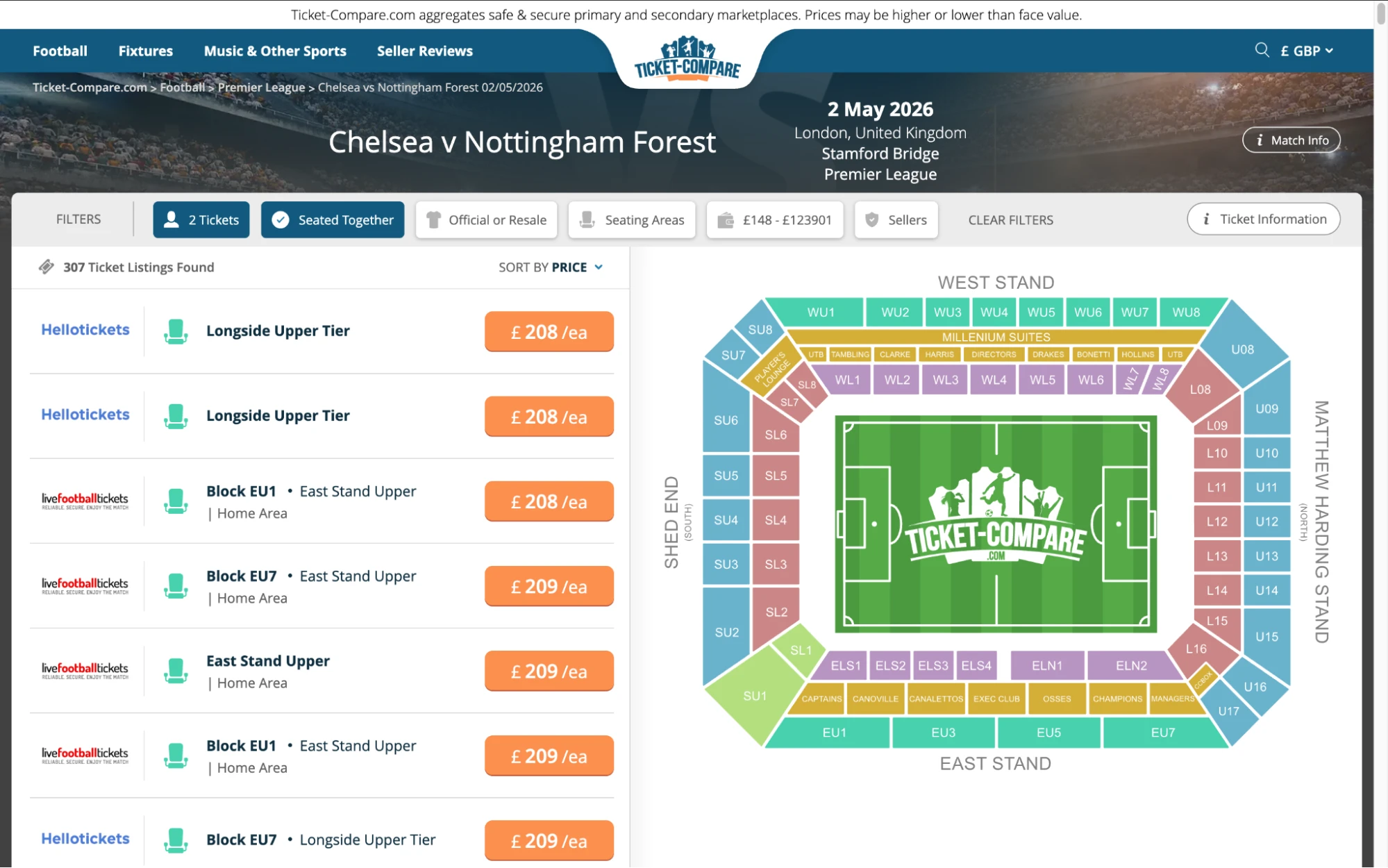 Här blir biljettjämförelseverktyg praktiskt: Se direkt vilka Chelseabiljetter som finns på förvalda andrahandsplatser och auktoriserade hospitalitypartners.